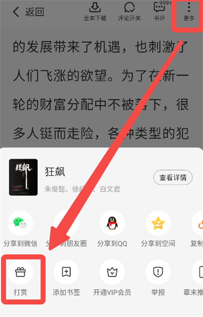 阅读页面点击【更多】,然后点击【打赏】选择想要打赏的礼物打赏即可。