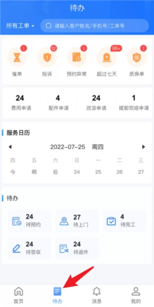 3、点击“待办”进入管理界面查看派单、预约与处理进度。