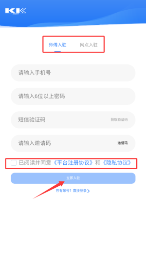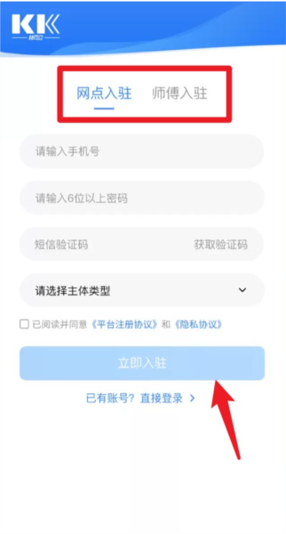 2、有师傅进驻和网点进驻,输入手机号码即可注册。