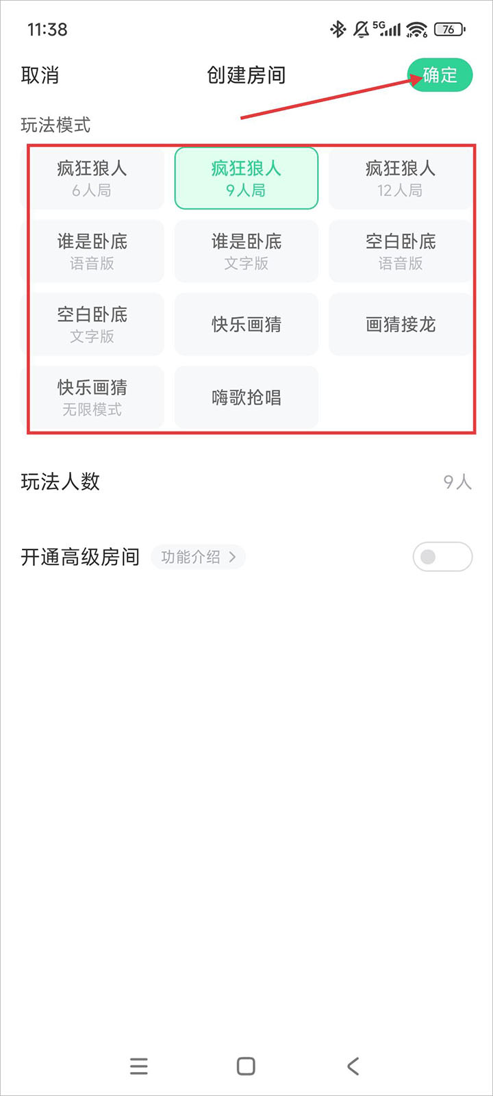 3、选择好房间类型后,再选择游戏模式,人数后,点击确定即可