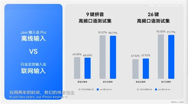 1、在9键模式下,Jovi输入法Pro的高频口语词汇首选正确率为68.6%,首行正确率则是90.77%。