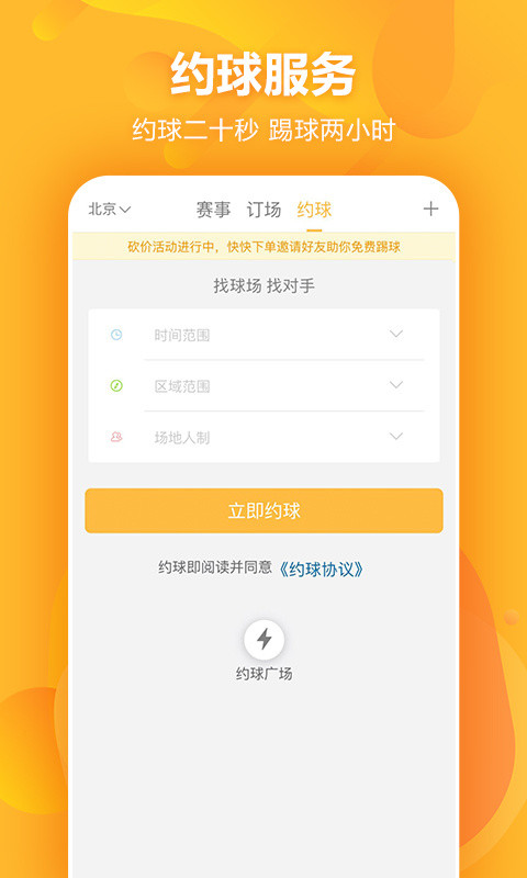 1、智能化大数据服务平台,线上即时匹配对手和场地,快速完成比赛预约,轻松约球二十秒、开心踢球两小时。