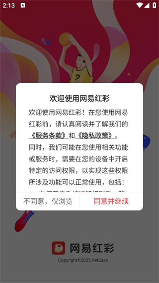 1、在本站下载安装网易红彩app,点击同意就能打开软件了。