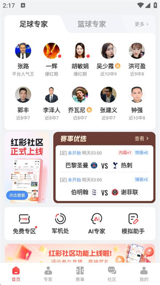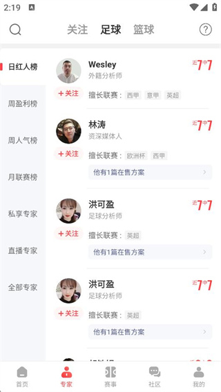 首页上方红人榜中有编辑每日精选状态出色的专家,另外点击“专家-足球/篮球”能看到周盈利榜以及周人气榜专家,点击关注不迷路!