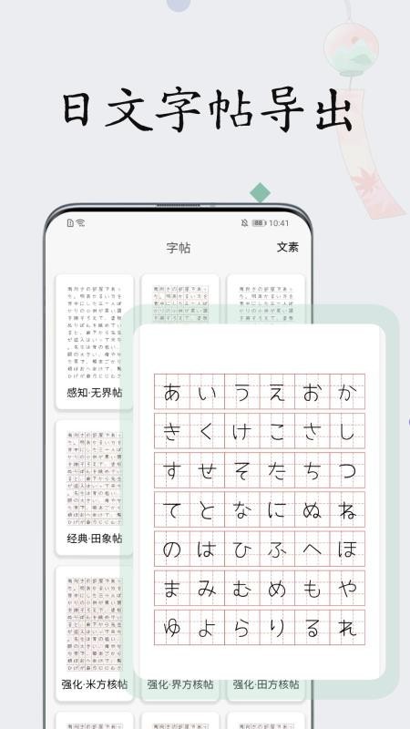 收录了大量的日语基础、名言、诗歌、俳句等日文作品作为练字的内容,同时支持自定义导入文字素材进行练习,一边练字一边感受日本文字以及日本文化的魅力。