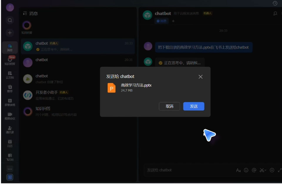 支持手机远程控制电脑,通过飞书、钉钉发送指令查看任务进度、审批文件或触发分析流程。