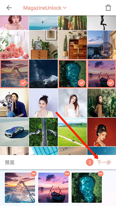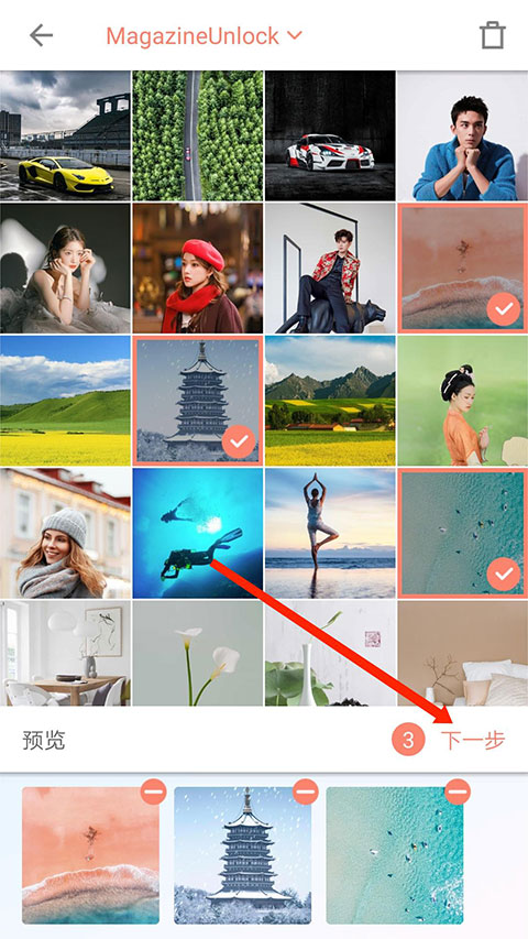 2、进入照片选择界面,勾选好需要的照片后,选择右下角“下一步”选项,