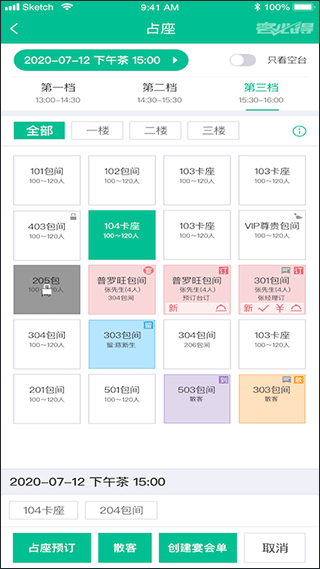 *支持餐厅服务人员在线帮助客人占座和下单,解决了预订台丢单、漏单、撞单等问题。