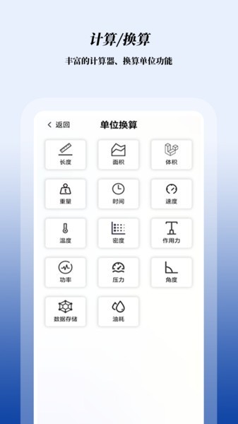 提供多达14种的单位换算功能,涵盖生活、科研和教学中常用的各种单位换算(长度、面积、体积、重量、时间、速度、温度等)。