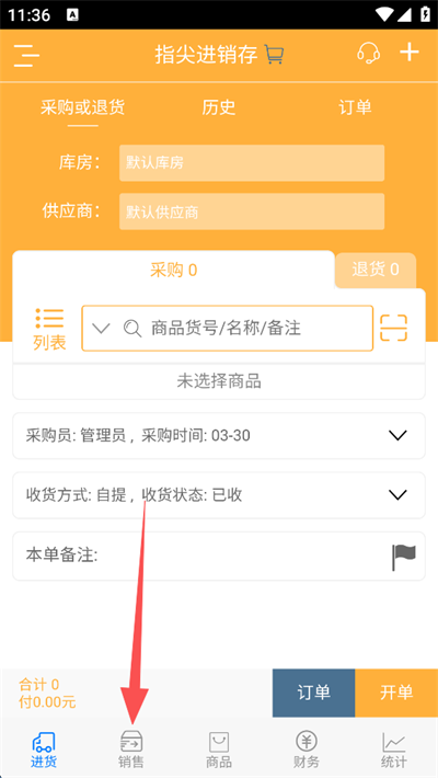 1、打开指尖进销存App,点击底部导航栏的"销售"选项;