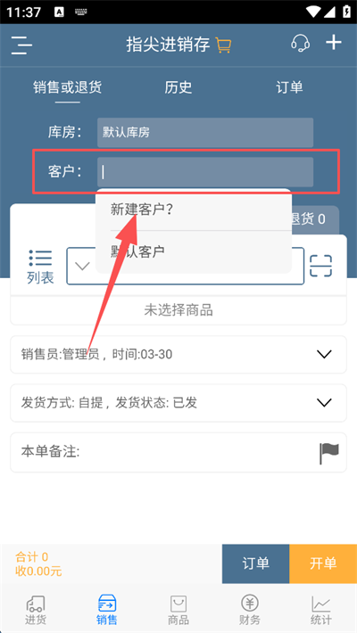 2、在销售页面的"客户"输入框中点击,在弹出的选项里选择"新建客户";