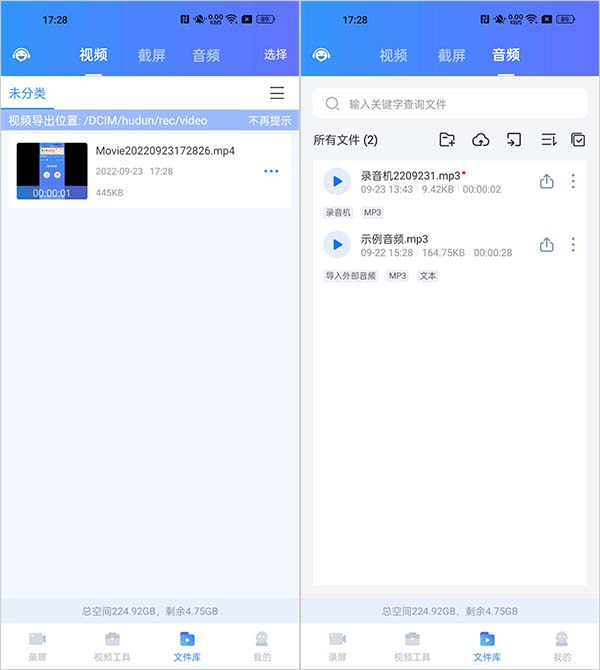 用户录制的视频可在软件的「视频库」中查看,也可以进入视频默认保存路径「/sdcard/hudun/rec」中查看,并且可以在查看的同时执行下载导出、在线制作编辑等操作