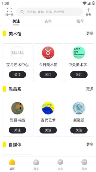 3、首页拥有丰富的美术馆信息,用户可以在线进行关注,提供艺术相关的头条看点。