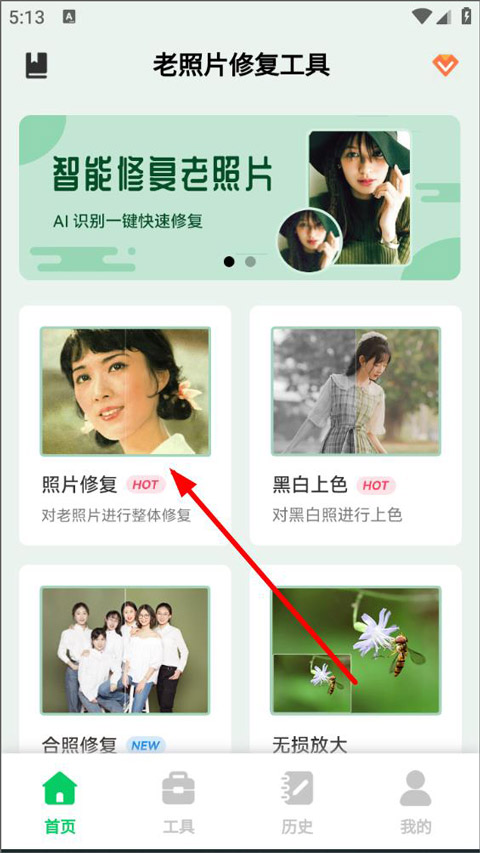 1、打开照片修复App,登录进入主页,主页功能有照片修复、黑白上色、合照修复、无损放大、智能美颜、进阶修复等,点击照片修复;