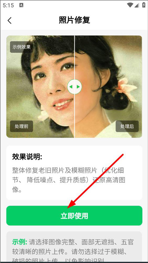 2、进入照片修复页面,用户可查看示例图和效果说明,在上传时选择图像完整、面部无遮挡、五官较清晰的图片,点击立即使用上传照片即可。