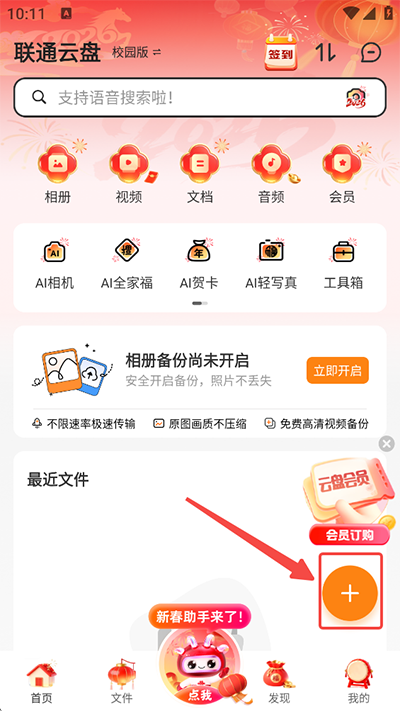1、下载并打开联通云盘app,来到主界面找到“+”选项并点击。