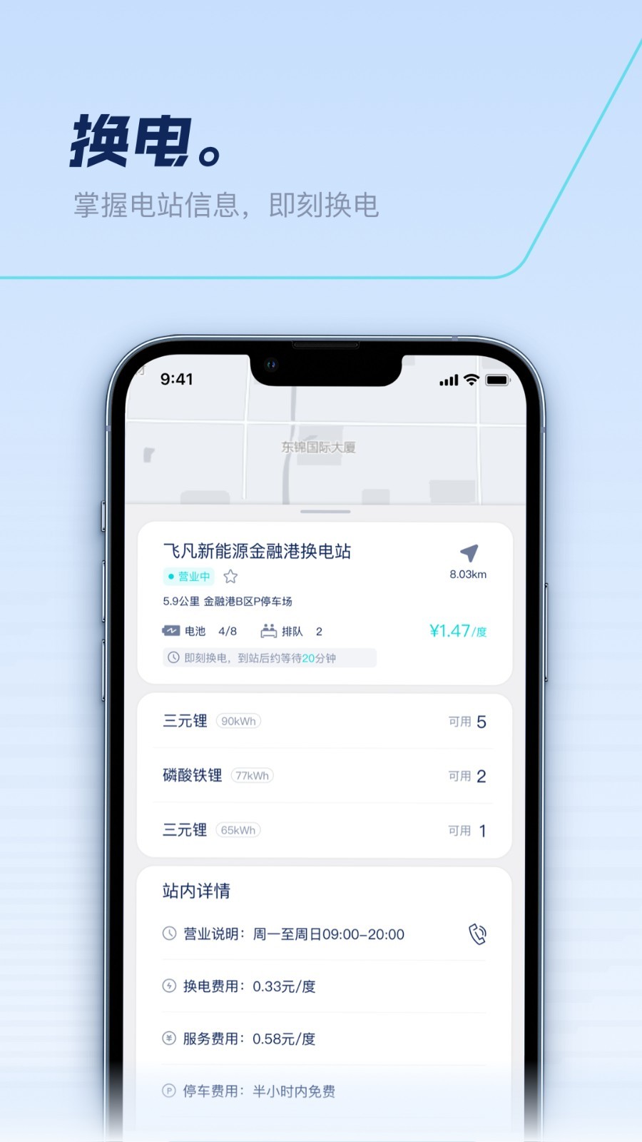 1、快速查找周边换电站和充电站,并可搜索站点、收藏站点,查看站点详情。