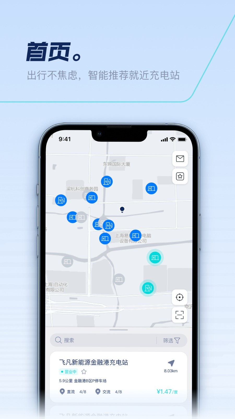 充电桩查找:允许访问位置权限后,APP自动显示周边充电桩。点击目标站点可查看详细信息。