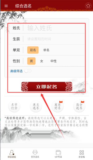 1、免费提供流行趋势以及生辰八字、五格三才、周易五行、论语国学、诗经楚辞、唐诗宋词、生肖喜用神等全面取名方式;