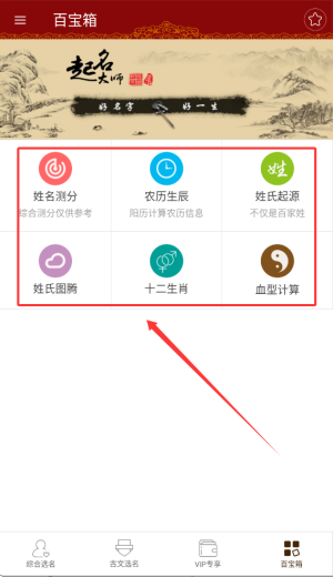 4、百宝箱集成姓名测试、农历生辰查询、姓氏溯源、生肖解析及血型计算等文化工具。