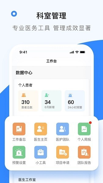 - 数据中心,直观展示科室的患者总数、新增数、预警患者数等运营数据,帮助科主任和医生安排工作