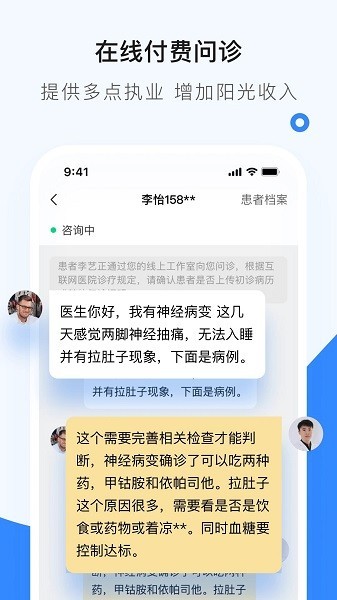 - 在线咨询、通知公告、复诊提醒,帮助医生提升诊疗效率,实现阳光收入,快速触达更多患者