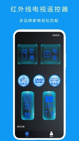 该应用支持电视、空调、投影仪、DVD、机顶盒、功放及IPTV等多种家电,通过内置红外码库实现多品牌设备的遥控。