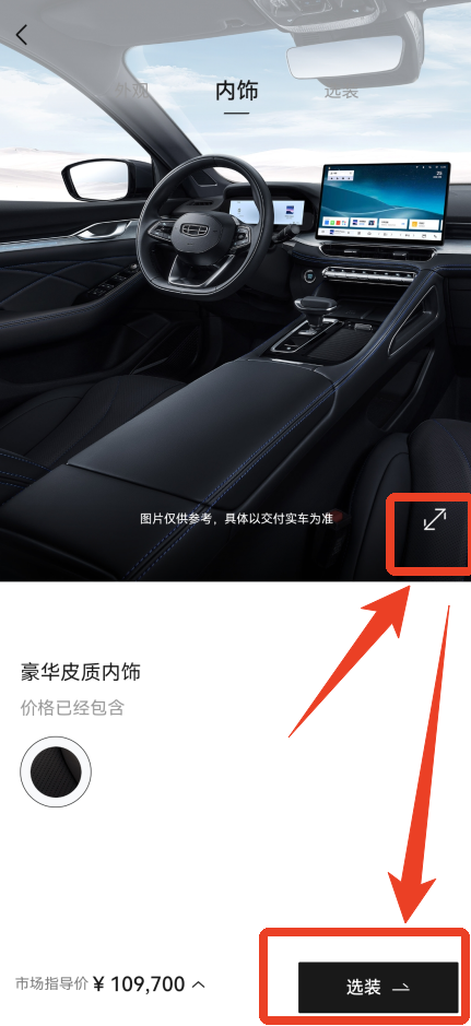 5、在内饰部分这辆车只有一个选项,点击上方图片的右下角可以全屏欣赏。