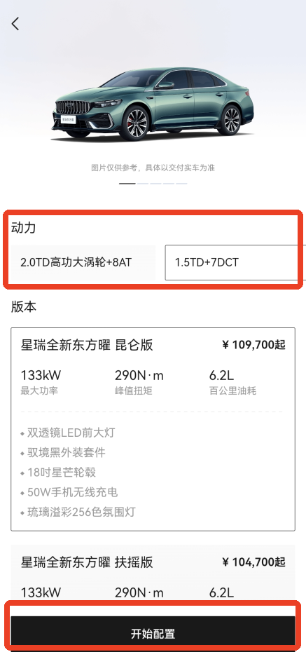 3、然后就是选择你的动力,下面还会有不同的版本供你选择,每个版本都有详细的信息,完成之后点击下方的【开始配置】。