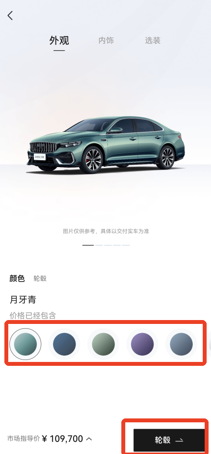 4、从颜色开始选起,有很多种颜色,大家可以一一点击看看效果,之后就是选择轮毂。