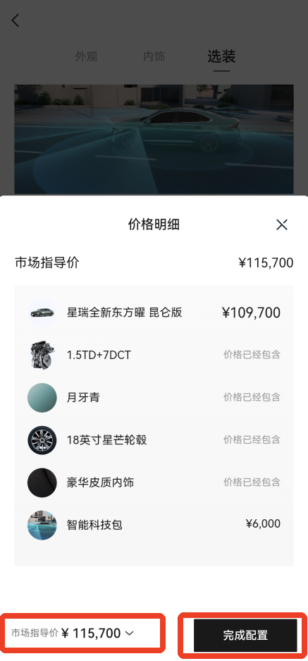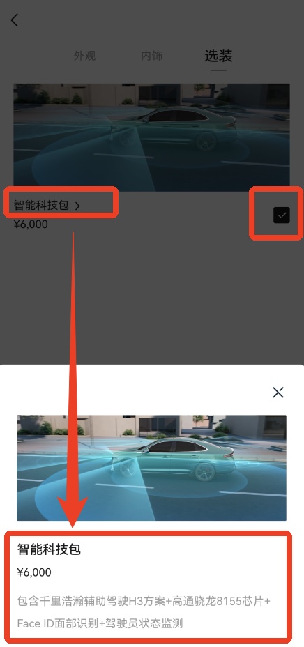 6、在选装方面,这辆车也只有一个选项,点击右边这个小方块打上√就能选择。点击【智能科技包】这个名字可以查看包含的内容。