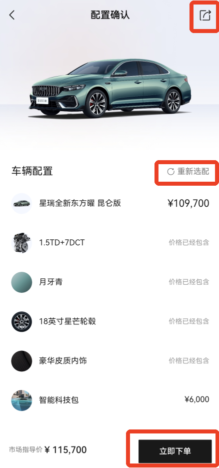 8、再一次确认车辆配置,可以重新选也可以右上角分享给别人,好了之后点击右下角【立即下单】就可以了。
