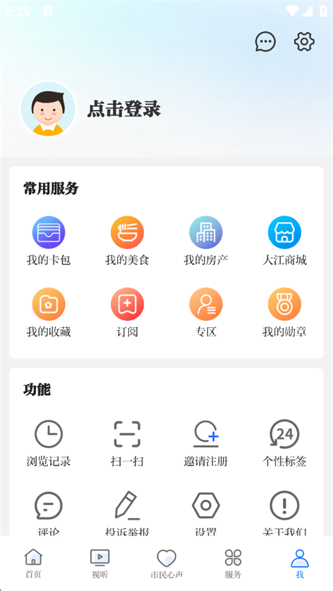 1、打开大江看看App,点击底部导航栏最右侧的"我"选项,进入个人中心页面;