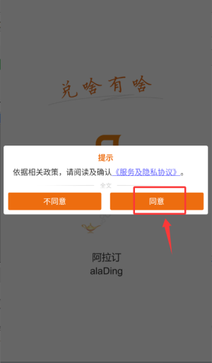 1、启动阿拉订应用,确认服务及隐私协议后进入。
