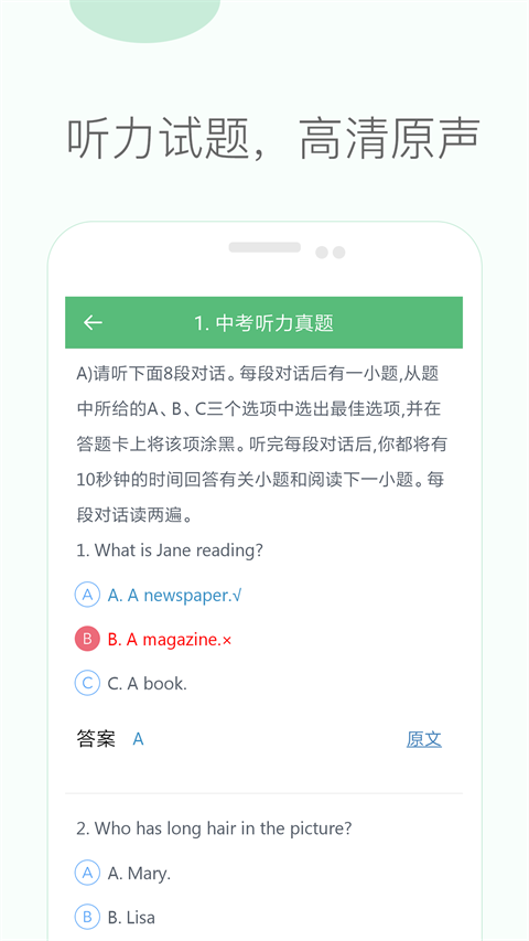 初中英语听力app是专为初中生打造的一款英语听力练习软件,它与初中课本知识相结合,很多教材上的原听力音频都能找到,上课没听懂的,还可以线下反复听,反复练。软件还有各种考试真题听力练习,还有各种模拟听力,分阶段练习,由简到难,最主要的还是要多加练习,赶快下载起来开始学习的第一步吧。