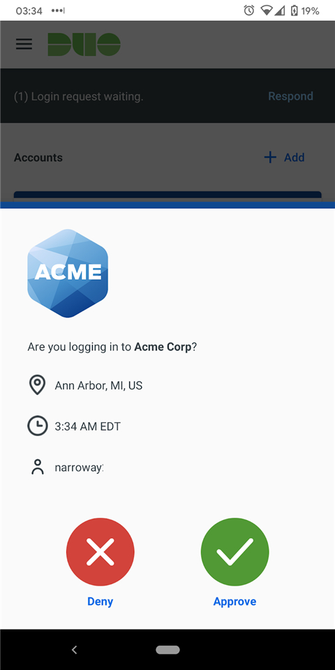 当屏幕上显示 Duo Push通知时,轻触指示的位置以查看可用操作:批准或拒绝。