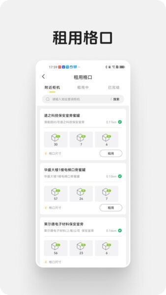 用户进入租用格口页面,根据快递包裹大小选择合适格口,结合附近柜机位置进行选择,确认后支付租用费用即可完成操作。