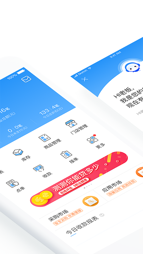 开台、点餐、验券、收银、加减退菜、外卖接单配送、各类运营报表、商品管理、库存管理、流水贷等。
