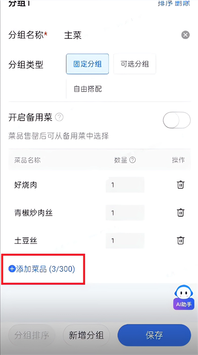 5、"分组类型"选择"固定分组",然后在菜品分组处添加套餐所需菜;