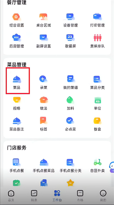 2、在"菜品管理"区域,点击"菜品"选项,进入菜品管理页面;