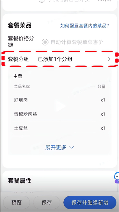 6、完成所有分组配置后,在"套餐菜品"页面确认套餐内容,最后点击"保存",完成套餐创建。