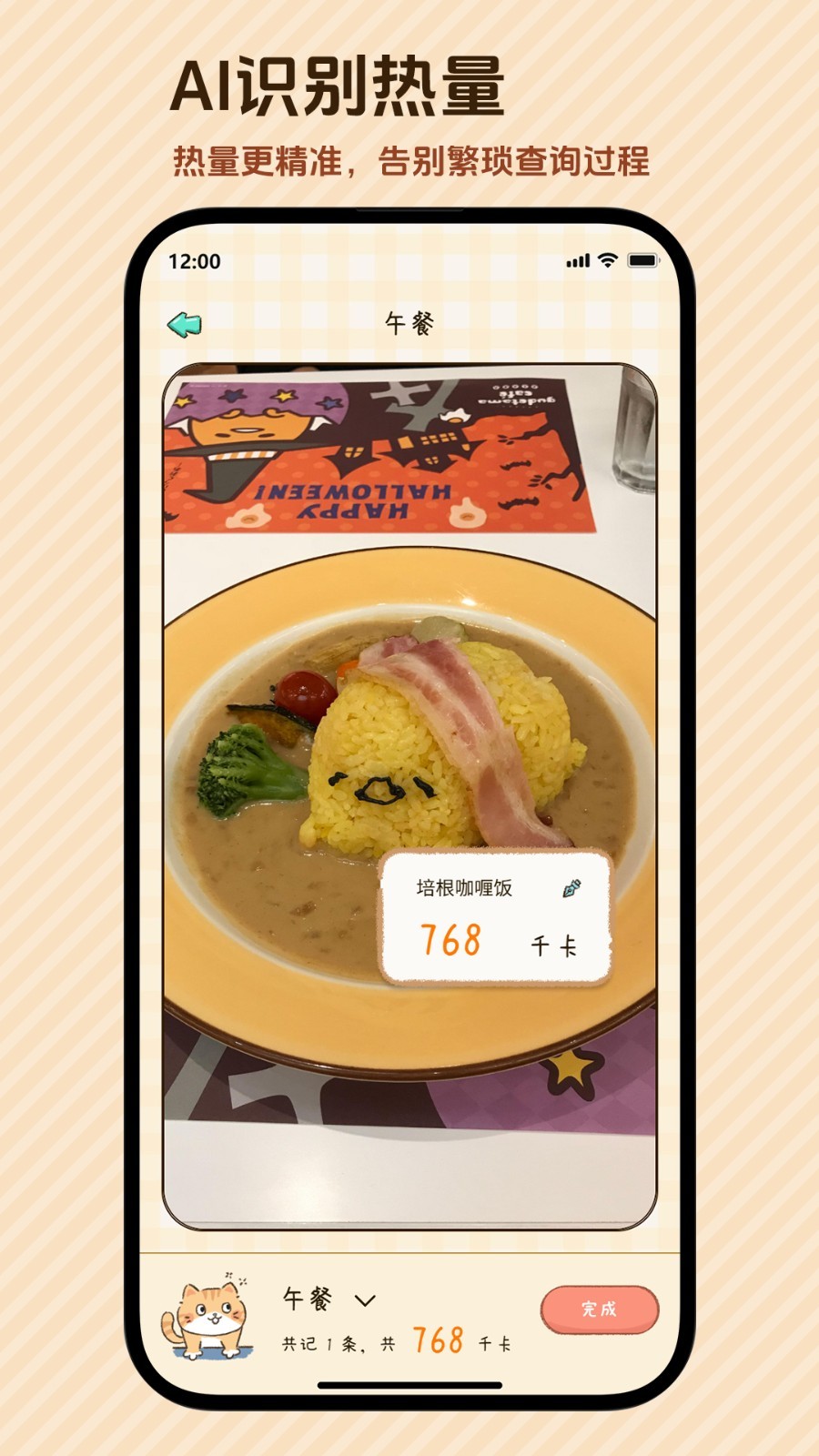 2、热量统计分析:实时计算每日已摄入热量与目标差值,用进度条直观展示完成率(45%)。