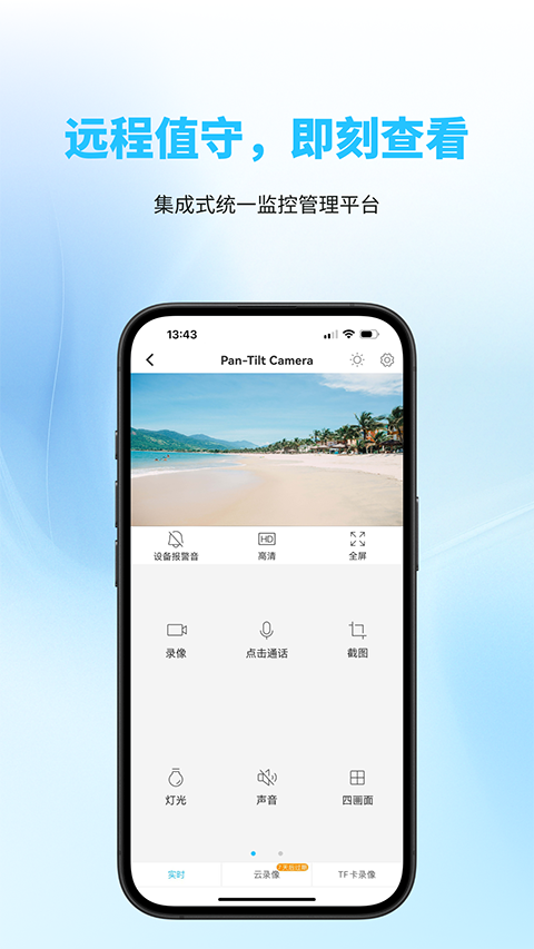1、随时随地查看住所、商铺、办公室等场所的实时视频,支持清晰流畅的画面传输。