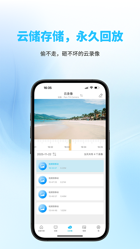2、支持查看云录像及设备本地录像,可按日期、时间段精准检索历史视频。