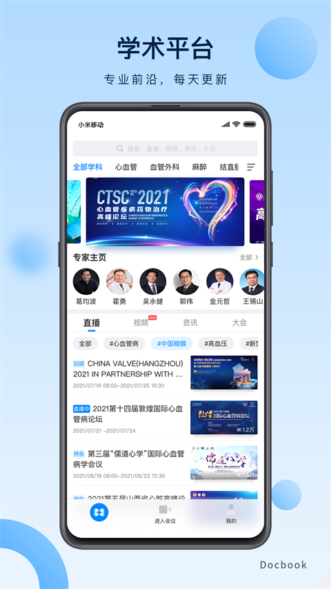 2、在学术会议板块浏览国内外最新研讨会信息,支持在线报名参与实时直播或观看往期录播内容。