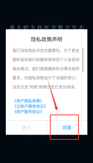 1、首次启动需阅读并确认用户协议条款,点击同意按钮后进入心血管专业医疗平台主界面。