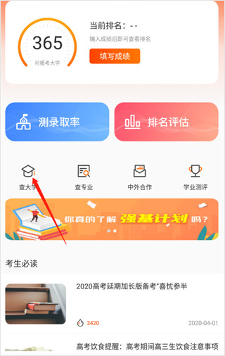 1、打开在本站下载的熊猫志愿填报app,我们可以看到首页有非常多的功能,如果你想要了解各大高校的话,可以点击查大学