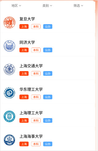 2、系统就会为你罗列出几乎全国所有的高校,而且你也可以通过地区和类别进行筛选