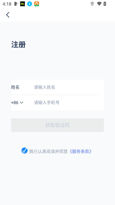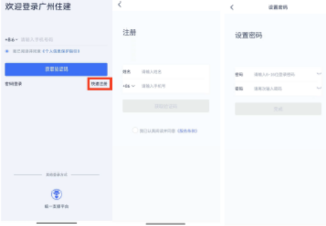 2、点击快速注册功能块,进入注册界面,输入姓名、手机号,输入验证码,设置账号密码,完成账号注册