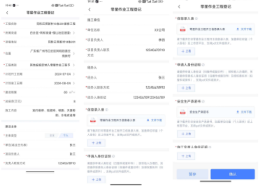 4、选择零星作业工程,点击信息录入按钮,进入下个界面再点击开始填报按钮,进入零星作业工程登记页面,按要求填报工程信息,包括工程基础信息,建设主体信息、施工单位信息、经办人信息、待上传的附件等。
